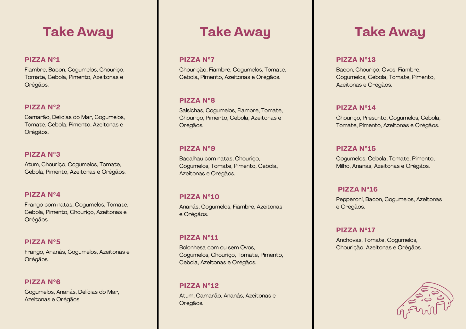 Se não gostar desta enorme variedade de ingredientes confeccionamos ainda a pizza Margarita (queijo, fiambre e molho de tomate).
